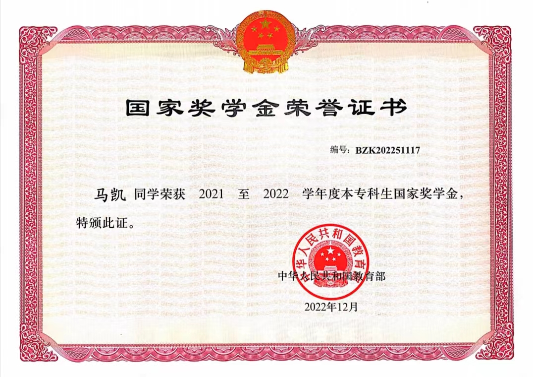 在大学期间,马凯同学具备团队精神,积极参与海南省创新创业大赛,能积极投身社会实践及志愿服务,作为一名党员,他时刻起到模范带头作用,在公司年度评优中多次获评“三好员工标兵”;多次获得国家励志奖学金;在全国高校传统文化知识竞答海南省一等奖;第十七届全国老员工文学创作大赛三等奖;在2021至2022学年度荣获本专科生国家奖学金。
