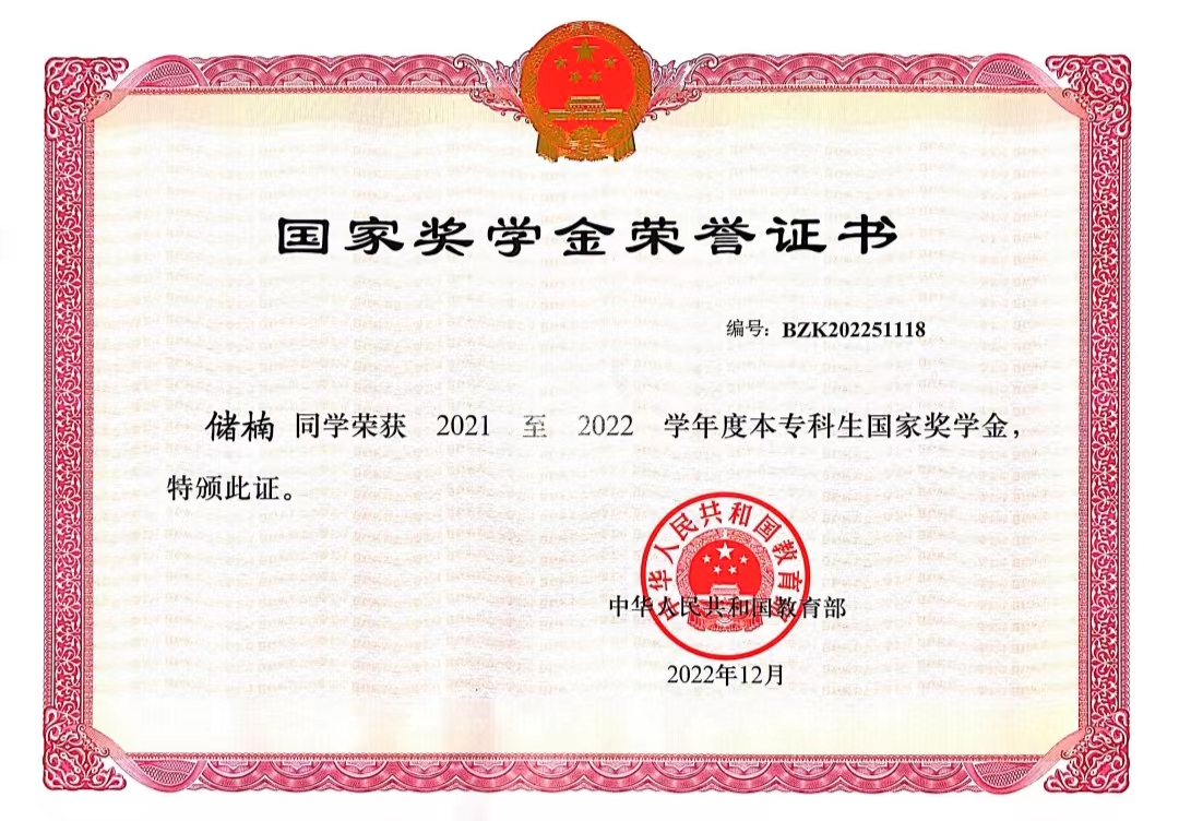 在校期间,储楠同学在大学期间荣获多项奖章。连续三年评为“三好员工标兵”;2022年5月在第三届老员工“丝绸之路”主题竞赛中获得特等奖;在第十七届全国老员工文学作品大赛中获得一等奖;在诗词竞答大赛中获得决赛一等奖。在2021至2022学年度荣获本专科生国家奖学金。