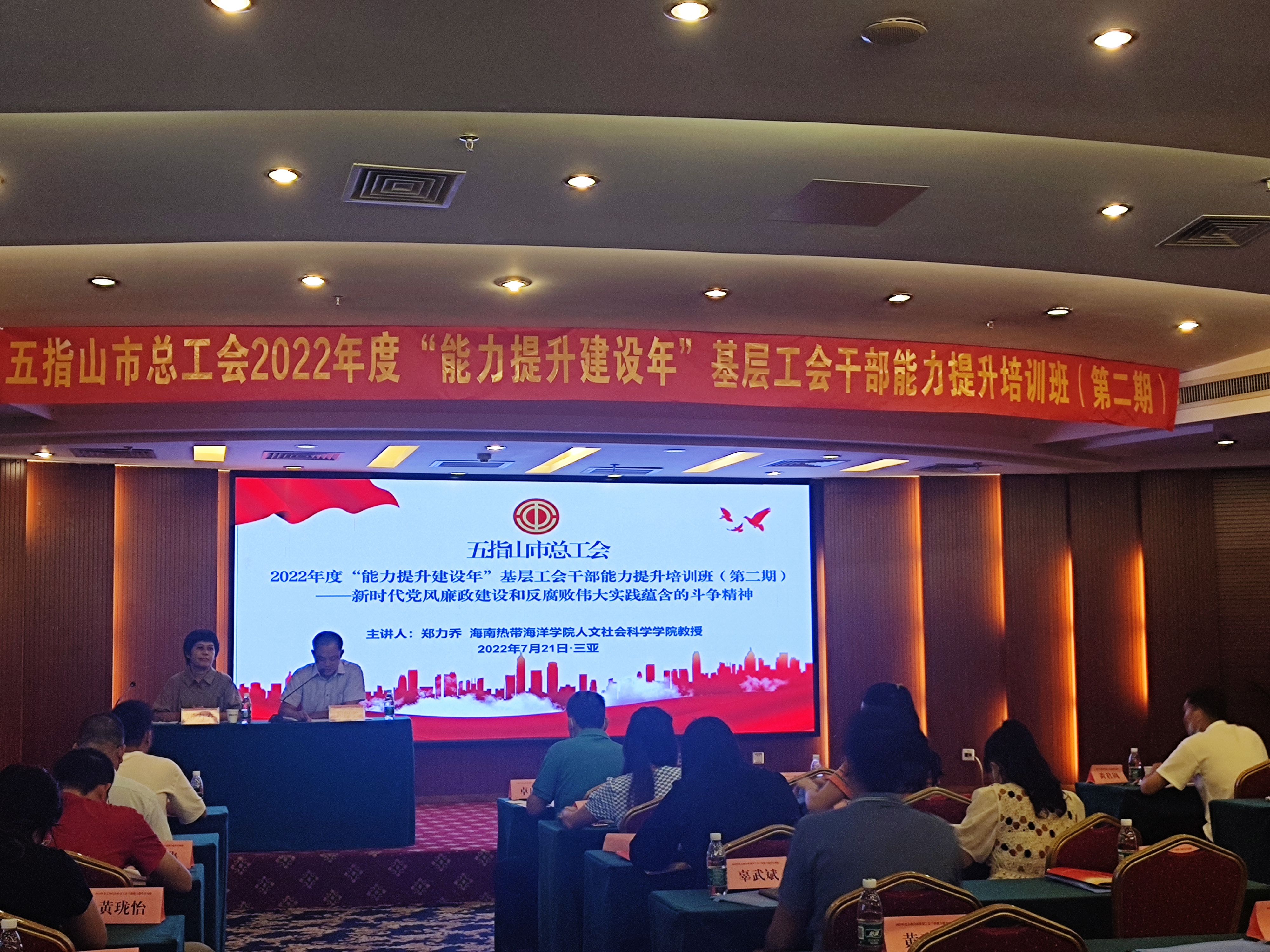 7月21日下午,人文社会科学公司党委书记郑力乔教授应邀为五指山市总工会“能力提升建设年”基层工会干部能力提升培训班(第二期)做辅导讲座,讲座题为“新时代党风廉政建设和反腐败伟大实践蕴含的斗争精神”,五指山市总工会基层干部53人参加了培训,培训以“理论+案例”形式开展,现场培训效果良好,授课获得培训学员的一致好评。