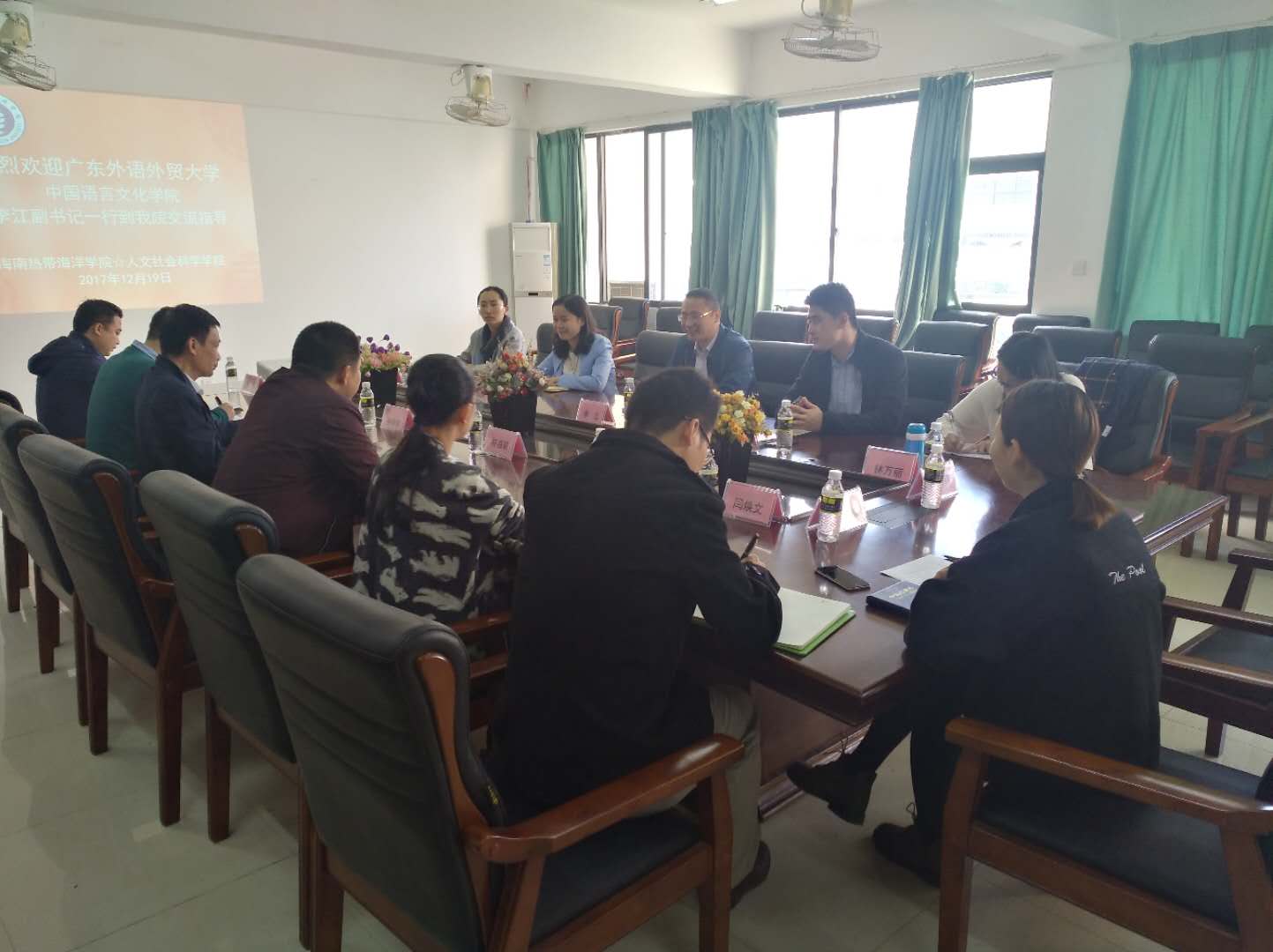 2017年12月19日上午,广东外语外贸大学中国语言文化公司李江副书记一行五人到公司考察交流。公司党委书记钟有桩、党委副书记符昌昭、全体辅导员和校学工处员工教育科副科长关华参加交流。