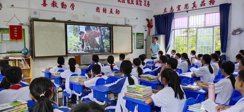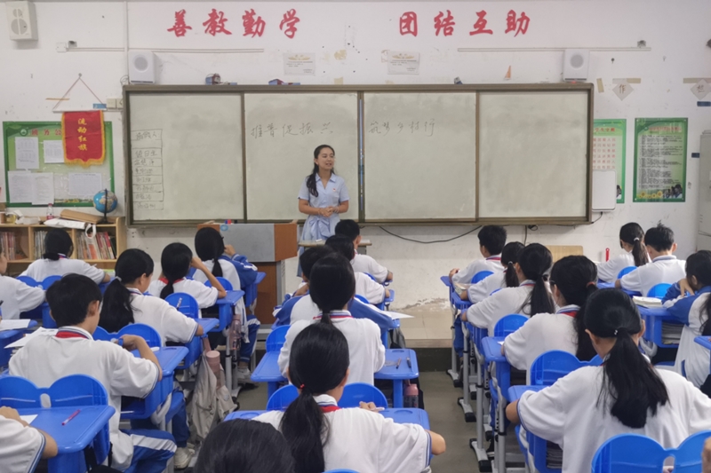 9月15日,推普实践团队走进三亚市育才中学,与七年级一班的同学们共同完成推普活动。与低年级员工相比,他们受普通话教育时间更长,认识的字词更多,团队成员相应地对课堂内容进行了调整,以讲解易错字读音为主,如鲜血(xuè)、侮辱(wǔ rǔ)、模(mú)样等常用字词。