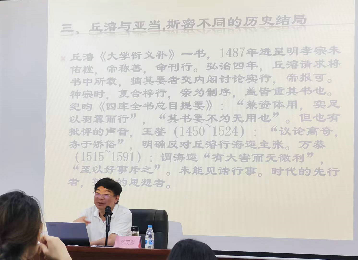 首先,张明富教授用通俗易懂的语言,联系明朝的史实,向同学们介绍了丘濬与亚当·斯密的生平。虽然两人家境悬殊,但是身份都是学者、官员,而且成就颇丰。其中丘濬具有刚毅、廉介、嗜学、经世的性格特点,而亚当·斯密治学极为严谨、为人孝顺。
