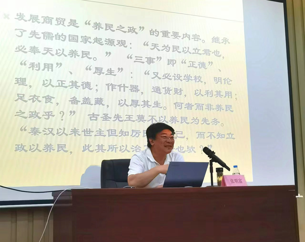 接着,张明富教授深入阐述了丘濬与亚当·斯密的的商贸观。对于丘濬,他从商贸主体观、商贸价值观、商贸范围观三个方面运用史料展开讲解。关于丘濬反对权力对商贸主体活动的过分干预,主张“民自为市”;质疑海禁,提倡海运。张明富进行了详细介绍,并指出这是超前的思想。对于亚当·斯密,张国富从《国富论》—这部市场经济的圣经着手,通过介绍书籍的主要内容,向大家展示亚当·斯密的观点“经济自由”。