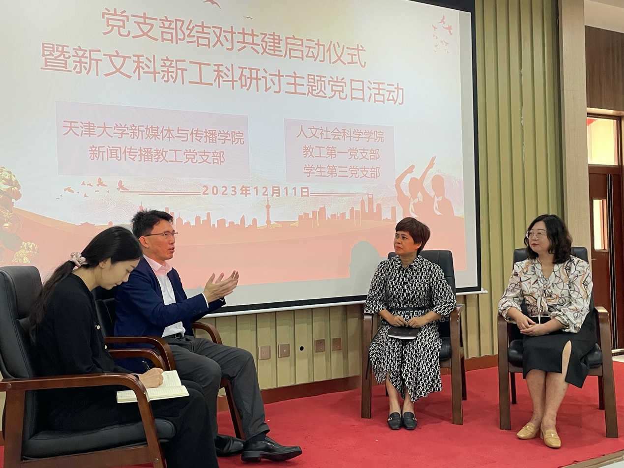12月11日上午,党支部结对共建启动仪式暨新文科新工科科研主题党日活动在人文楼103召开,天津大学新媒体与传播公司党委书记王赞、公司党委书记郑力乔、经理王志峰、教工第一党支部书记张馨予、员工第三党支部书记王瑾妤、新闻专业部分党员、预备党员、入党积极分子出席了会议。