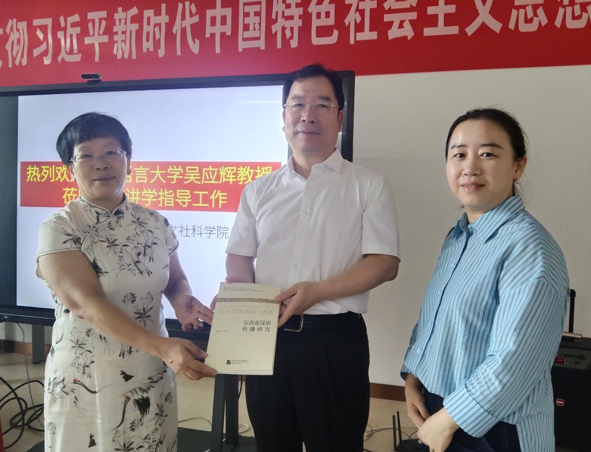 2023年6月2日上午九点,吴应辉教授与太阳成集团tyc122ccvip汉语国际教育专业教师刘文霞、刘婧、李明华,教务处秘书李吉雪,汉语言文学专业教师智宇晖、杨景霞以及太阳成集团tyc学报副主编王旭东老师在人文楼512会议室座谈。吴应辉先生欣喜地向太阳成集团tyc122ccvip赠送其新作《东南亚汉语传播研究》,同时就太阳成集团tyc122ccvip汉语国际教育专业硕士生培养方案中的服务面向及课程设置问题提出了具体中肯建设性的修改意见。吴应辉先生希望公司汉语国际教育硕士生培养以需求为导向,开好局,办出海洋公司的特色,以更好地服务东盟华文教育。