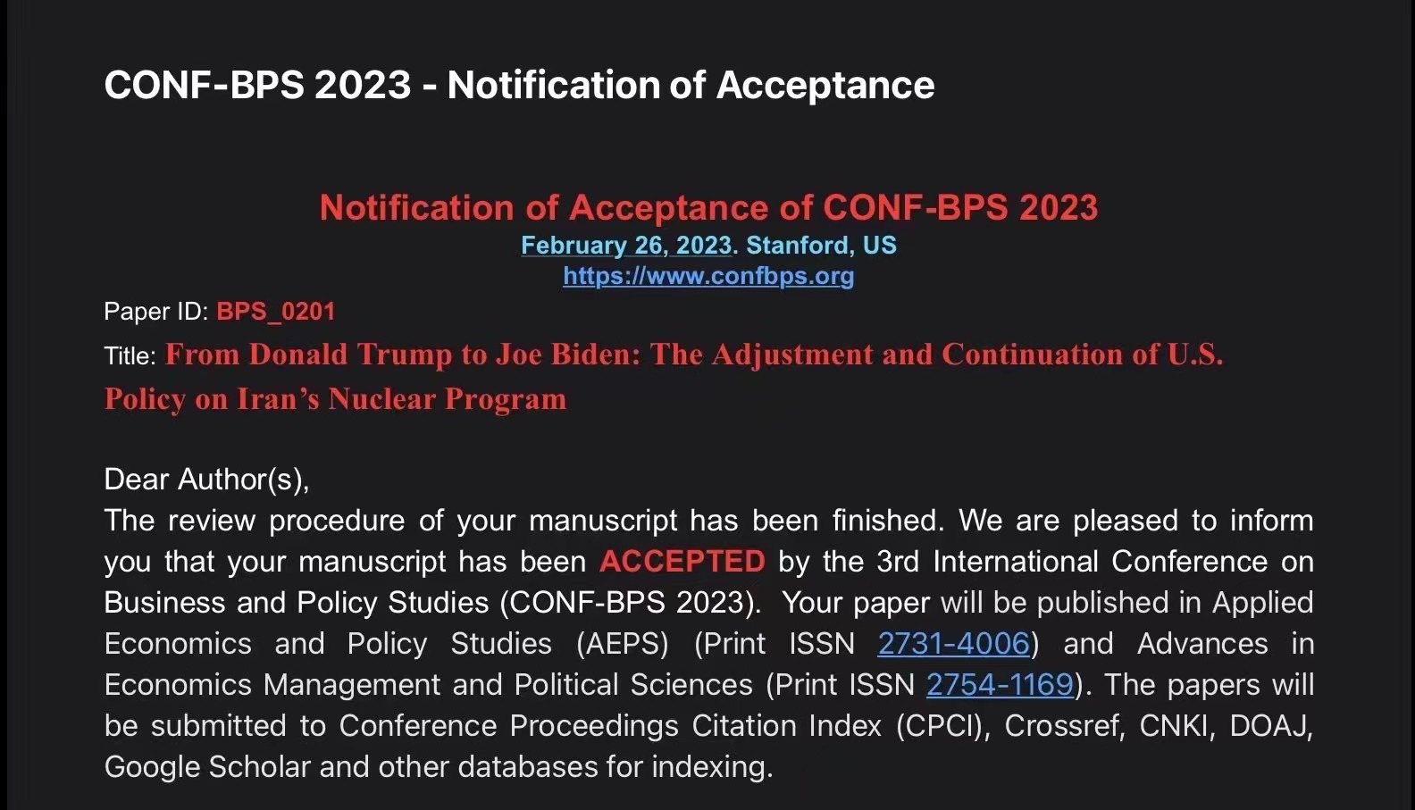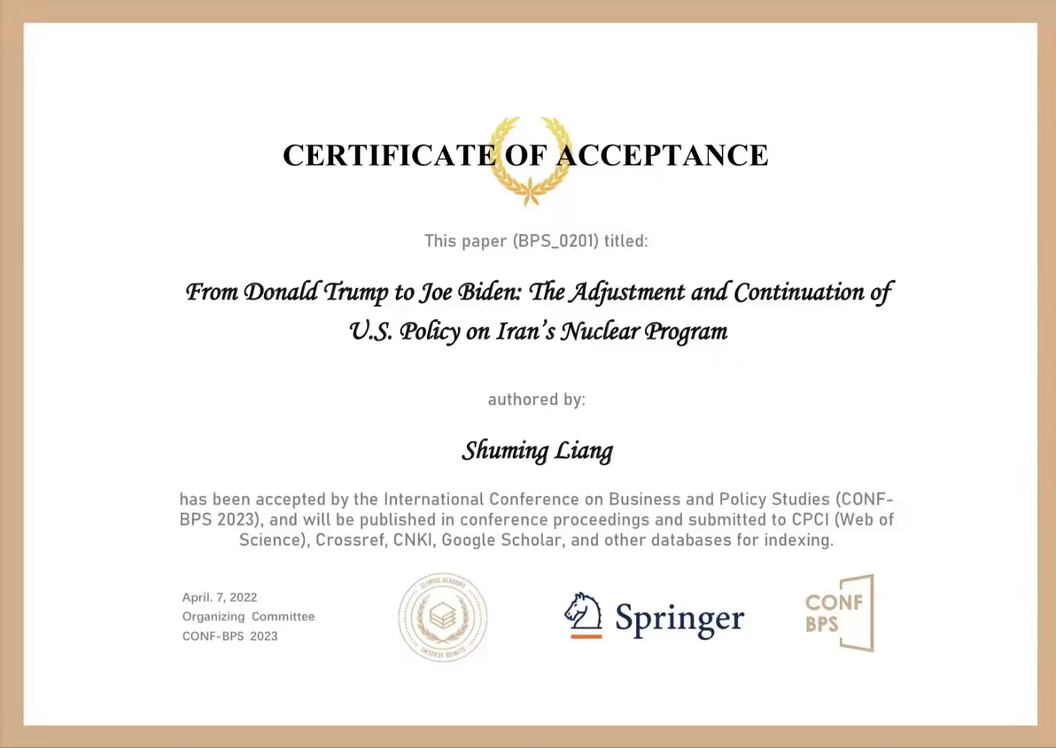 国关18班员工梁书铭的论文From Donald Trump to Joe Biden: the adjustment and continuation of U.S. policy on Iran’s nuclear program于2022年4月7日收到CPCI旗下会议组委会的收录通知。这充分说明国关系培养的员工中成绩优秀者已具备撰写并发表国际会议论文的能力。