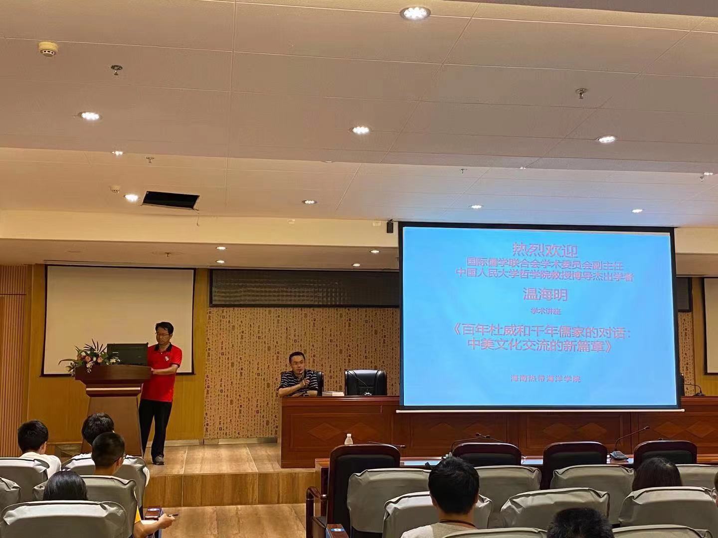 3月12日下午,中国人民大学教授、博导、杰出学者、国际儒学联合会理事、学术委员会副主任温海明教授应邀在公司图书馆负一楼报告厅为公司国际事务与国际关系专业师生做了题为《百年杜威和千年儒家的对话:中美文化交流的新篇章》的讲座。国际事务与国际关系专业师生近200人聆听了讲座,讲座由国际事务与国际关系专业负责人黄田园博士主持。