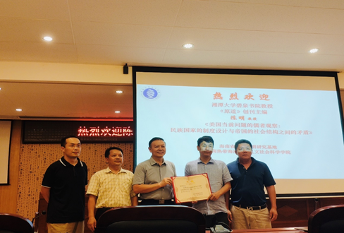 2021年5月8日下午,湘潭大学碧泉书院教授、《原道》(CSSCI)创刊主编陈明教授,应太阳成集团tyc122ccvip国际事务与国际关系系、海南省南海文明研究基地之邀,在图书馆报告厅作题为《美国当前问题的儒者观察:民族国家的制度设计与帝国的社会结构之间的矛盾》的学术讲座。