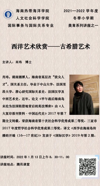 1月13日:8:30—11:00由本专业肖玮老师作题为《西洋艺术欣赏——古希腊艺术》的学术讲座。员工听讲后撰写700字心得。