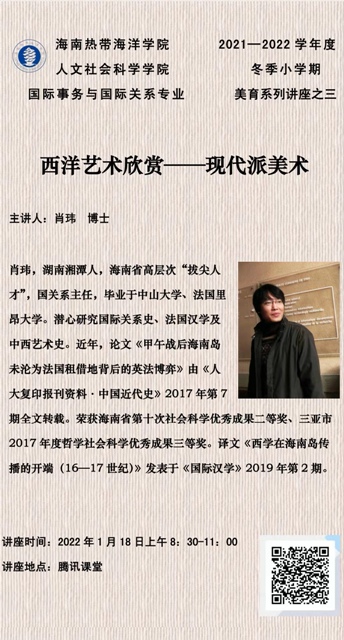 1月18日:8:30—11:00由本专业肖玮老师作题为《西洋艺术欣赏——现代派美术》的学术讲座。员工听讲后撰写700字心得。