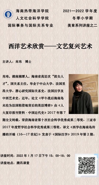 1月17日:15:00—18:00由本专业肖玮老师作题为《西洋艺术欣赏——文艺复兴艺术》的学术讲座。员工听讲后撰写700字心得。